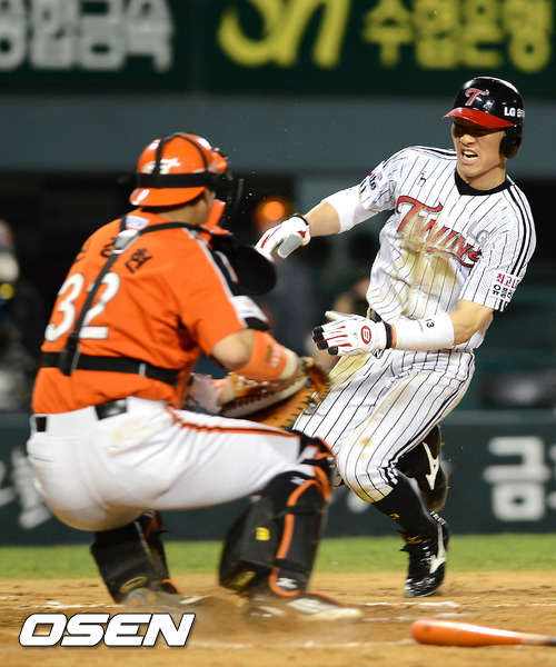 3일 오후 서울 잠실야구장에서 열린 '2012 팔도 프로야구' LG 트윈스와 한화 이글스의 경기, 7회말 1사 3루 LG 오지환의 내야땅볼때 3루주자 김일경이 태그아웃되고 있다.