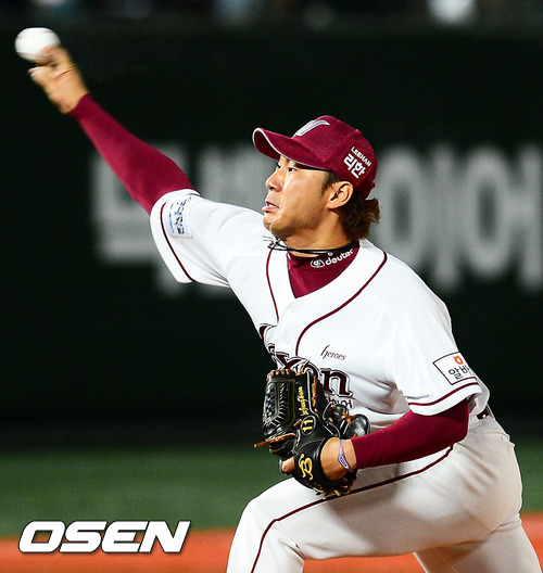 3일 오후 서울 목동구장에서 열린 '2012 팔도 프로야구' 넥센 히어로즈와 롯데 자이언츠의 경기 7회초 1사 주자 1,2루 롯데 황재균 타석에서 넥센 선발 밴헤켄 대신 교체 투입된 이정훈이 힘차게 공을 뿌리고 있다.