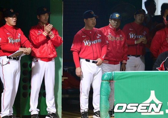 3일 오후 광주구장에서 열린 '2012 팔도 프로야구' KIA 타이거즈와 SK 와이번스의 경기 9회말 2사 이만수 감독이 경기를 바라보고 있다.
