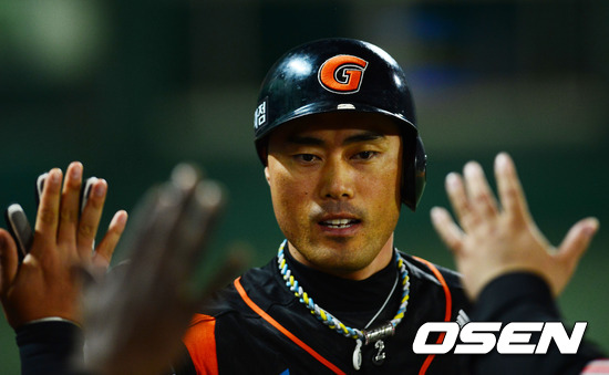 3일 오후 서울 목동구장에서 열린 '2012 팔도 프로야구' 넥센 히어로즈와 롯데 자이언츠의 경기 8회초 2사 주자 1,3루 롯데 강민호의 중견수 앞 1타점 적시타때 홈을 밟은 조성환이 덕아웃에서 동료들과 하이파이브를 하고 있다.
