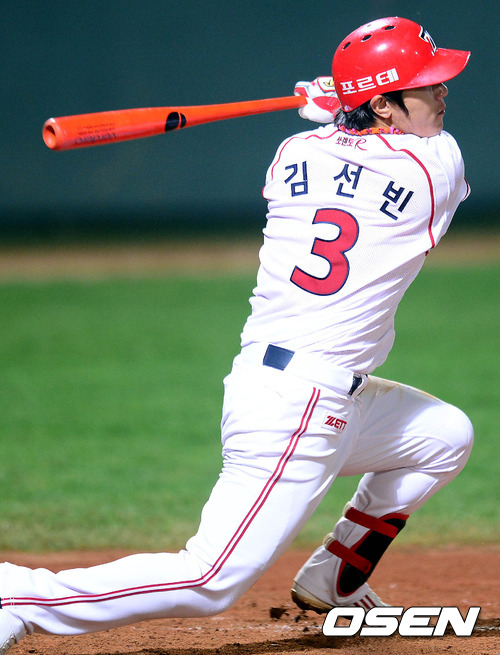 3일 오후 광주구장에서 열린 '2012 팔도 프로야구' KIA 타이거즈와 SK 와이번스의 경기 9회말 2사 만루 김선빈이 2타점 적시타를 치며 동점을 만들고 있다.