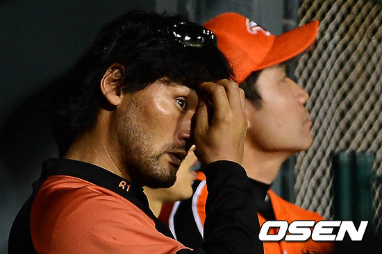 3일 오후 서울 잠실야구장에서 열린 '2012 팔도 프로야구' LG 트윈스와 한화 이글스의 경기, 9회말 무사 1,2루 한화 바티스타가 LG 양영동에게 볼넷을 허용하자 박찬호가 아쉬운 표정을 짓고 있다.