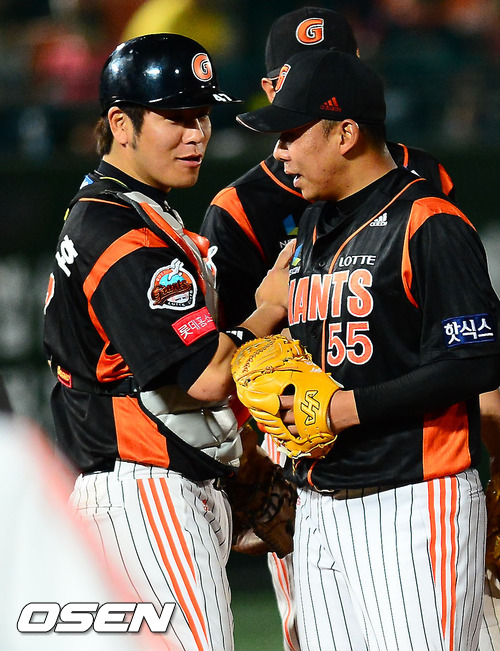 경기를 마치고 롯데 강민호와 김사율이 기쁨을 나누고 있다. / rumi@osen.co.kr