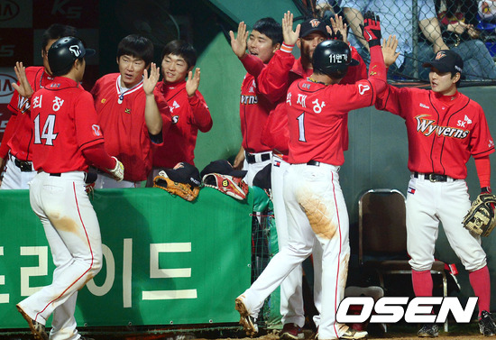 3일 오후 광주구장에서 열린 '2012 팔도 프로야구' KIA 타이거즈와 SK 와이번스의 경기 12회초 2사 1,2루 안치용이 2타점 적시타에 홈을 밟은 최정과 박재상이 덕아웃에서 동료들과 하이파이브를 하고 있다.