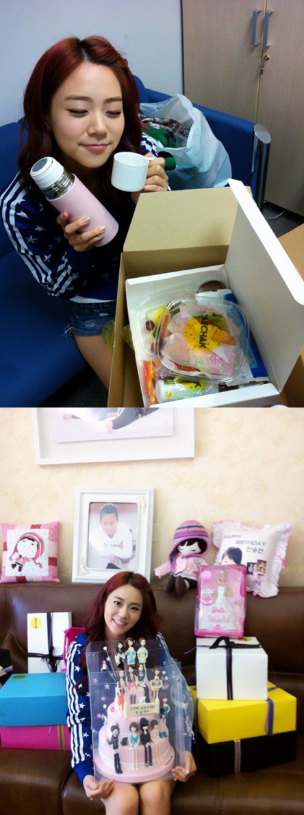 사진 속 한승연은 팬들이 보내 준 선물, 보온병, 케이크 등을 들고 행복한 미소를 지어 보이고 있다. 한승연의 옆에는 선물 상자들이 한가득 쌓여 있어 카라를 향한 팬들의 사랑이 느껴지는 듯 하다.