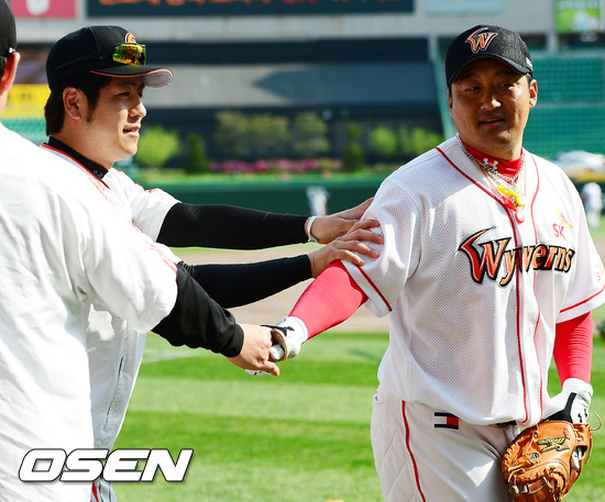 4일 오후 인천 문학구장에서 '2012 팔도 프로야구' SK 와이번스와 롯데 자이언츠의 경기가 열릴 예정인 가운데 양팀 훈련시간에 롯데 강민호와 홍성흔이 SK 조인성의 배트를 빌려 테스트를 해본 후 말을 하고 있다.