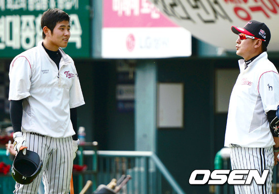 4일 서울 잠실구장에서 LG 김기태 감독이 김재율과 이야기를 나누고 있다.