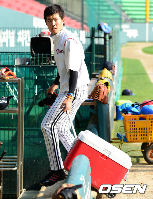 경기전 LG 임찬규가 물통을 끌며 더그아웃으로 향하고 있다.
