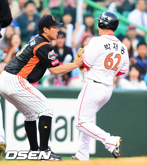4일 오후 인천 문학구장에서 열린 '2012 팔도 프로야구' SK 와이번스와 롯데 자이언츠의 경기에서 1회말 2사 주자 1루 SK 김강민의 중견수 앞 1루타때 1루 주자 박재홍이 3루에서 롯데 3루수 황재균에게 태그아웃 당하고 있다.