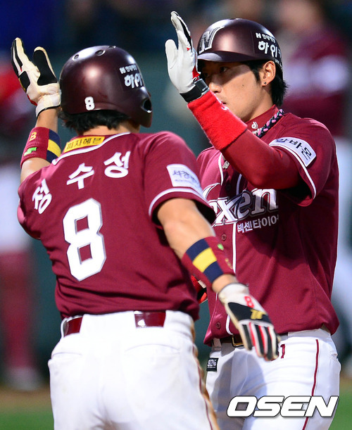 4일 오후 광주구장에서 열린 '2012 팔도 프로야구' KIA 타이거즈와 넥센 히어로즈의 경기 3회초 무사 1루 투런포를 친 장기영이 홈에서 정수성과 하이파이브를 하고 있다.