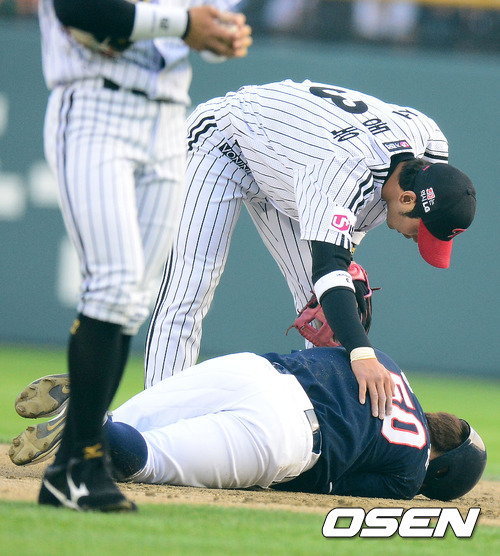 김현수가 1회 1사 1루에서 우전안타를 치고 나간 뒤 김동주의 우전안타 때 2루로 진루했다. 김현수는 3루로 달리려다 귀루하던 상황에서 베이스에 손가락을 부딪히며 고통을 호소하고 있다.