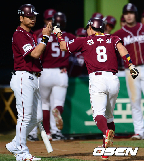 4일 오후 광주구장에서 열린 '2012 팔도 프로야구' KIA 타이거즈와 넥센 히어로즈의 경기 3회초 무사 1루 장기영의 투런포에 홈을 밟은 정수성이 덕아웃으로 들어가며 이택근과 하이파이브를 하고 있다.