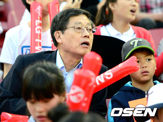 4일 오후 서울 잠실구장에서 열린 '2012 팔도 프로야구' LG 트윈스와 두산 베어스의 경기에 김황식 국무총리가 어린이들과 야구경기를 관전 하고 있다.