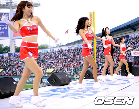 4일 오후 서울 잠실구장에서 열린 '2012 팔도 프로야구' LG 트윈스와 두산 베어스의 경기에 LG 치어리더들이 멋진 공연을 펼치고 있다.