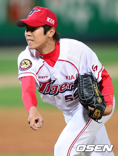 4일 오후 광주구장에서 열린 '2012 팔도 프로야구' KIA 타이거즈와 넥센 히어로즈의 경기 5회초 1사 1루 서재응에서 교체된 홍성민이 역투하고 있다.