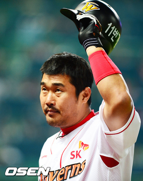 4일 오후 인천 문학구장에서 열린 '2012 팔도 프로야구' SK 와이번스와 롯데 자이언츠의 경기에서 6회초 1사 주자 없는 상황에서 SK 이호준이 중월 솔로 홈런을 날린 후 덕아웃에서 팬들에게 인사를 하고 있다.