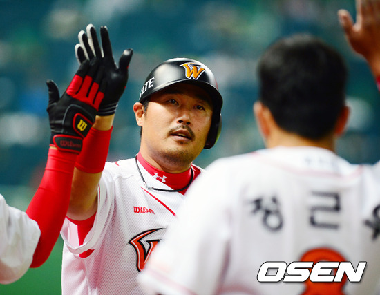 4일 오후 인천 문학구장에서 열린 '2012 팔도 프로야구' SK 와이번스와 롯데 자이언츠의 경기에서 6회초 1사 주자 없는 상황에서 SK 이호준이 중월 솔로 홈런을 날린 후 덕아웃에서 동료들과 하이파이브를 나누고 있다.