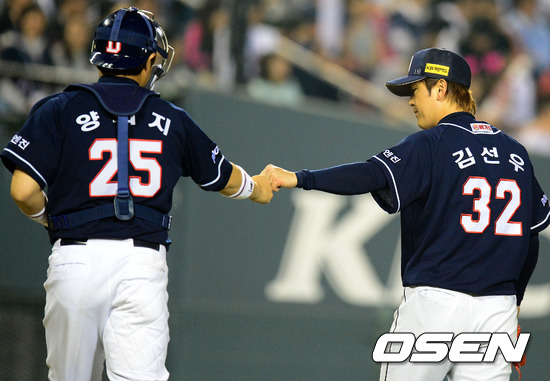 4일 오후 서울 잠실구장에서 열린 '2012 팔도 프로야구' LG 트윈스와 두산 베어스의 경기, 6회말 수비를 마친 두산 양의지와 김선우가 주먹을 맞대고 있다. 김선우는 6이닝 2실점 호투중.