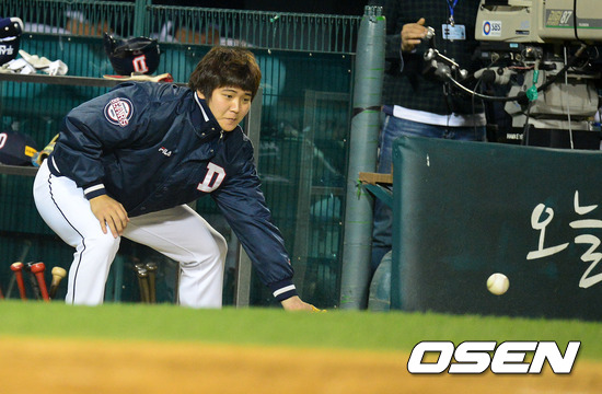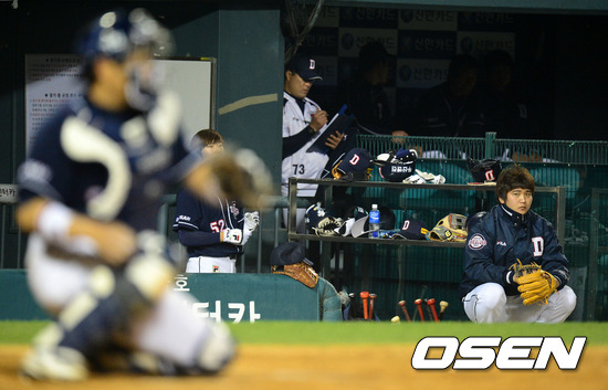 4일 오후 서울 잠실구장에서 열린 '2012 팔도 프로야구' LG 트윈스와 두산 베어스의 경기, 7회 공수교대에 두산 임태훈에 더그아웃 앞에서 포수 자세로 앉아 내야진의 연습하고 마친 볼을 받아내고 있다.