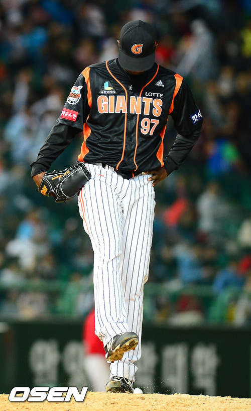 4일 오후 인천 문학구장에서 열린 '2012 팔도 프로야구' SK 와이번스와 롯데 자이언츠의 경기에서 8회말 무사 주자 1루 롯데 유먼이 교체되며 마운드를 차고 있다.