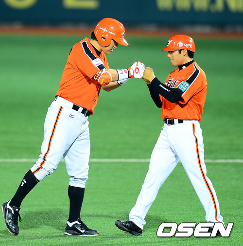 4일 오후 대구구장에서 열린 '2012 팔도 프로야구' 삼성 라이온즈와 한화 이글스의 경기 7회초 무사 만루 한화 장성호가 주자일소 3타점 역전 적시타를 날린 후 최만호 코치와 하이파이브를 하고 있다