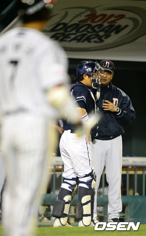4일 오후 서울 잠실구장에서 열린 '2012 팔도 프로야구' LG 트윈스와 두산 베어스의 경기, 7회말 2사 만루에서 LG 이병규 타석에 두산 김진욱 감독이 그라운드로 나와 양의지와 이야기를 나누고 있다.