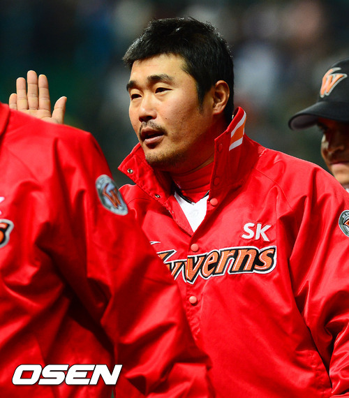 경기를 마치고 SK 이호준이 코치들과 하이파이브를 하고 있다. / rumi@osen.co.kr