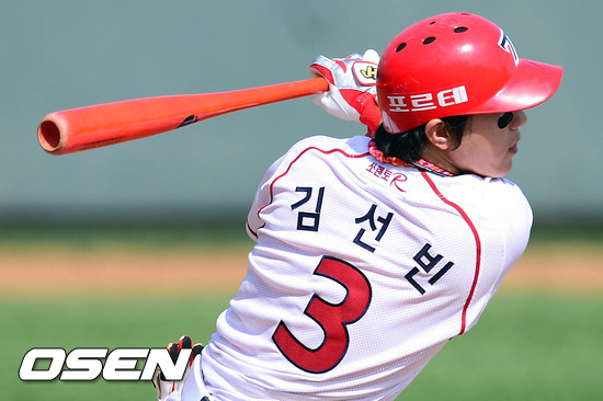 5일 오후 광주구장에서 열린 '2012 팔도 프로야구' KIA 타이거즈와 넥센 히어로즈의 경기 5회말 1사 3루 김선빈이 1타점 적시타를 치고 있다.