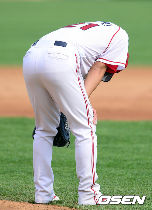 5일 오후 광주구장에서 열린 '2012 팔도 프로야구' KIA 타이거즈와 넥센 히어로즈의 경기 8회초 무사 2,3루 장기영의 타석 윤석민의 2루 견제볼이 빠지면서 3루주자 서건창이 득점하자 윤석민이 고개를 숙이고 있다.