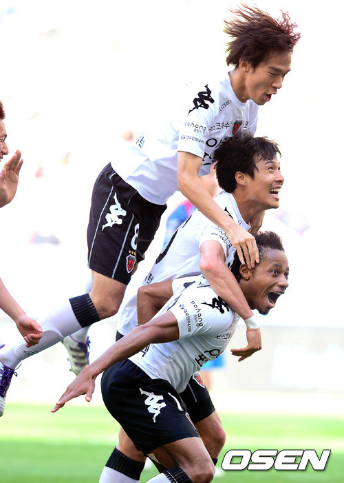 5일 어린이날 FC 서울과 포항 스틸러스가 서울월드컵경기장에서 K리그 11라운드 경기를 가졌다. 경기 후반 포항 아사모아가 동점골을 넣고 동료들과 기쁨을 나누고 있다.