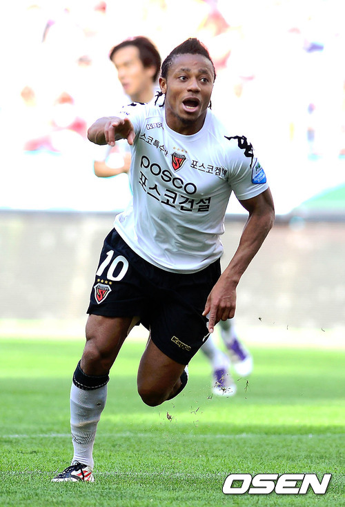 5일 어린이날 FC 서울과 포항 스틸러스가 서울월드컵경기장에서 K리그 11라운드 경기를 가졌다. 경기 후반 포항 아사모아가 동점골을 넣고 환호하고 있다.