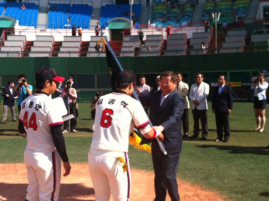한국야구위원회(KBO) 구본능 총재가 5일 목동구장에서 열린 제5회 KBO 총재기 전국대학야구대회 결승전에서 우승을 차지한 동국대에 우승기를 수여하고 있다. /대한야구협회 제공