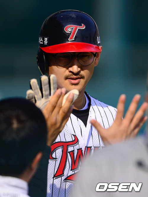 6일 오후 서울 잠실구장에서 열린 2012 팔도 프로야구 LG 트윈스와 두산 베어스의 경기 7회말 1사 2루 LG 이진영이 동점 적시타를 날렸다. 2루 주자 박용택이 동료들의 축하를 받고 있다