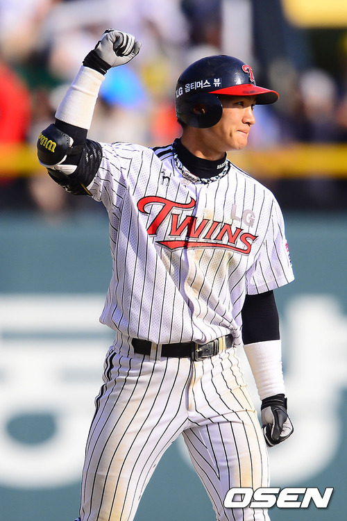 6일 오후 서울 잠실구장에서 열린 2012 팔도 프로야구 LG 트윈스와 두산 베어스의 경기 7회말 1사 1,2루 LG 오지환이 1타점 적시타를 날린 후 주먹을 쥐며 환호하고 있다