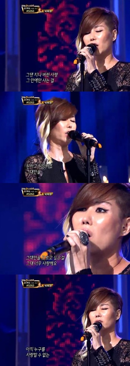 6일 방송된 MBC 예능 프로그램 '일밤-나는 가수다2'(이하 '나가수2')에서 박미경은 '원하고 원망하죠'를 선곡해 매혹적인 무대를 꾸몄다.