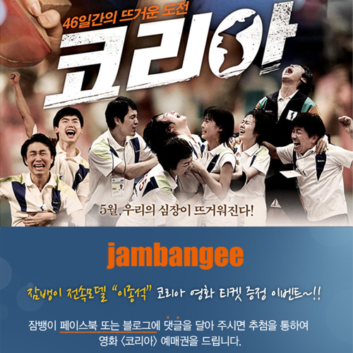 이번 예매권 이벤트에 뽑힌 영화는 '코리아'다. 코리아는 지난3일 개봉해 호평을 받고 있는 남북 탁구선수들의 우정 이야기다. 특히, 잠뱅이 전속모델 이종석이 출현해 눈길을 끈다.