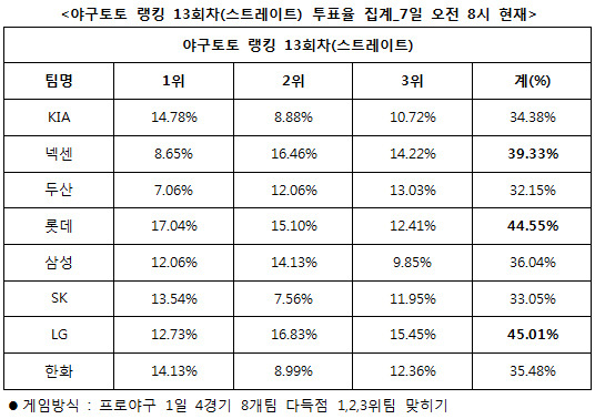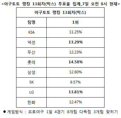 한편, 순위에 상관없이 다득점 3개팀을 맞히는 '박스' 게임에서는 롯데(14.58%), LG(13.81%), 넥센(13.29%)이 가장 많은 득점을 기록할 것으로 집계됐다. 다득점 가능성 하위 예상팀으로는 KIA(11.25%)와 SK(9.57%)가 꼽혔다.