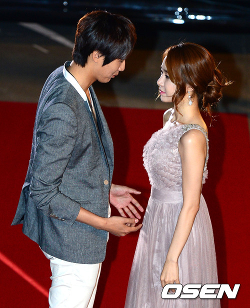 지현우와 유인나가 레드카펫 장면을 촬영하며 포즈를 취하고 있다.