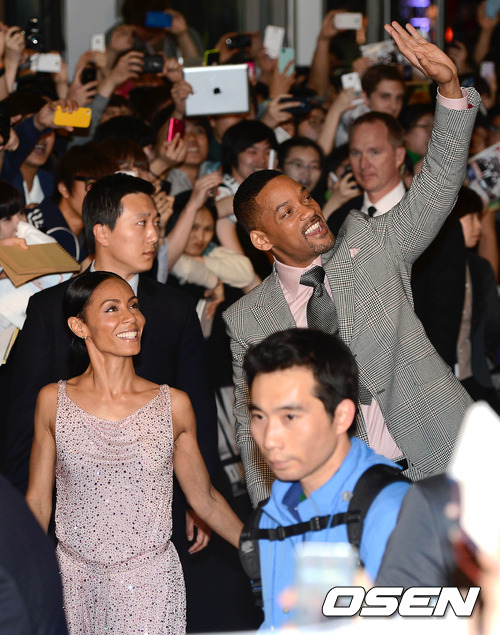 7일 오후 서울 CGV 영등포에서 열린 영화 '맨 인 블랙 3'(수입/배급: 소니 픽쳐스 릴리징 브에나 비스타 영화㈜, 감독: 베리 소넨필드) 레드카펫 & 프리미어 행사에서 할리우드 배우 윌 스미스가 아내 제이다 핀켓 스미스와 함께 관객들을 향해 인사를 하고 있다.