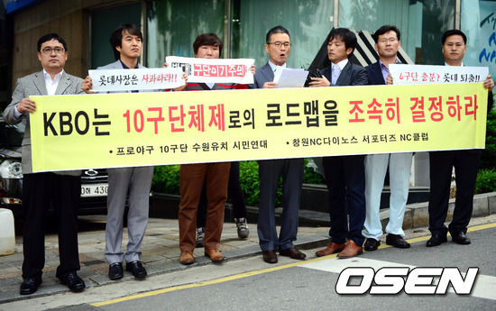 8일 오전 서울 도곡동 한국야구위원회(KBO) 야구회관에서 NC 다이노스의 2013시즌 1군 리그 참여 및 10구단 결정 이사회가 열리는 가운데 프로야구 10구단 수원유치를 위한 시민연대 및 창원 NC 다이노스 서포터스 들이 10구단 유치를 위해 성명서를 발표하고 있다.
