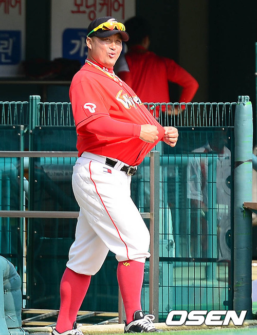 8일 오후 서울 잠실구장에서 열리는 '2012 팔도 프로야구' 두산 베어스와 SK 와이번스의 경기 시작전 SK 조인성이 두산 최준석에게 장난스런 제스처를 취하고 있다.