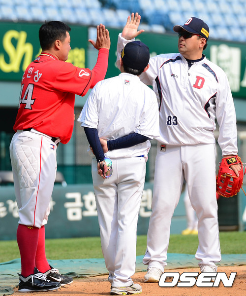 8일 오후 서울 잠실구장에서 열리는 '2012 팔도 프로야구' 두산 베어스와 SK 와이번스의 경기 시작전 SK 조인성이 두산 이토 쓰토무 코치와 인사를 나누고 있다.