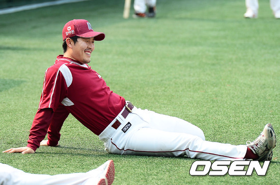 8일 오후 서울 목동구장에서 '2012 팔도 프로야구' 넥센 히어로즈와 LG 트윈스의 경기가 열릴 예정인 가운데 훈련시간에 넥센 1군에 합류한 넥센 김병현이 몸을 풀며 환하게 미소짓고 있다.