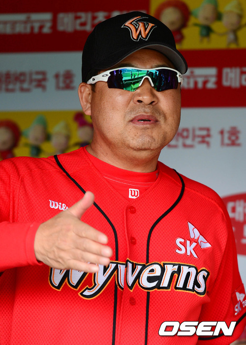 8일 오후 서울 잠실구장에서 열리는 '2012 팔도 프로야구' 두산 베어스와 SK 와이번스의 경기 시작전 이만수 감독이 취재진들과 이야기를 나누고 있다.