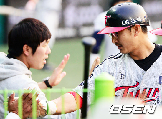 8일 오후 서울 목동구장에서 열린 '2012 팔도 프로야구' 넥센 히어로즈와 LG 트윈스의 경기 1회초 1사 주자 3루 LG 최동수가 좌익수 희생플라이 아웃 된 후 3루 주자 박용택이 홈인, 덕아웃에서 동료들과 하이파이브를 하고 있다.