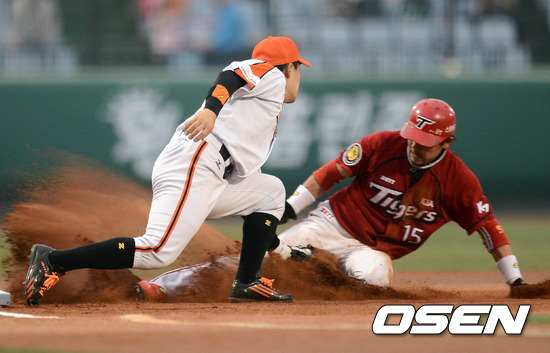 8일 오후 대전 한밭야구장에서 열린 '2012 팔도 프로야구' 한화 이글스와 KIA 타이거즈의 경기, 1회초 1사 2루 KIA 안치홍 타석때 2루주자 이용규가 도루에 실패하고 있다.