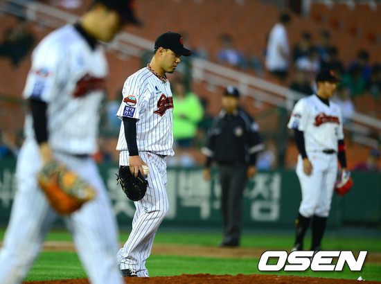 실점을 허용한 롯데 송승준 투수가 아쉬운 표정으로 마운드에 오르고 있다.