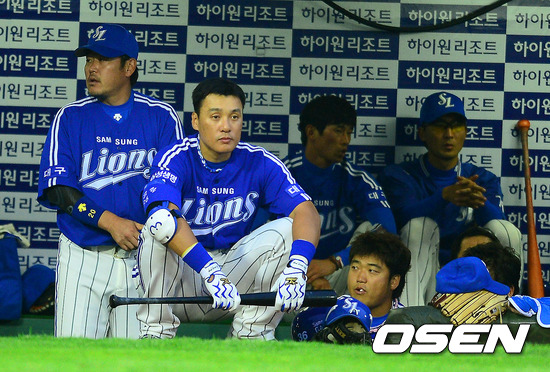 8일 오후 부산 사직구장에서 열리는 2012 팔도 프로야구 롯데 자이언츠와 삼성 라이온즈의 경기 3회초 삼성 이승엽이 그라운드에 주저 앉아 경기를 지켜보고 있다.