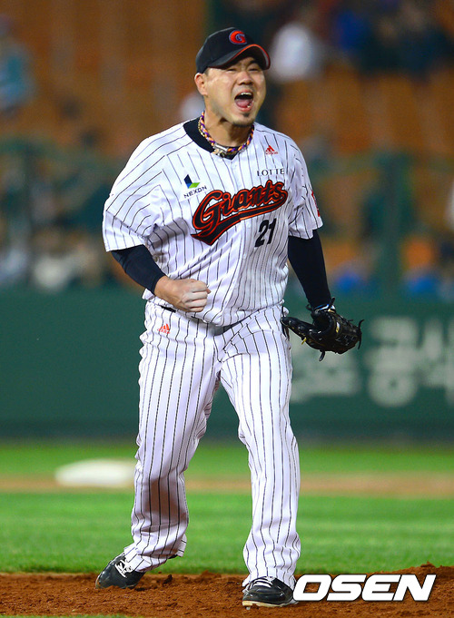 8일 오후 부산 사직구장에서 열리는 2012 팔도 프로야구 롯데 자이언츠와 삼성 라이온즈의 경기 7회초 2사 1,2루 삼성 정형식을 삼진아웃으로 잡은 롯데 송승준 선발투수가 주먹을 쥐며 환호하고 있다