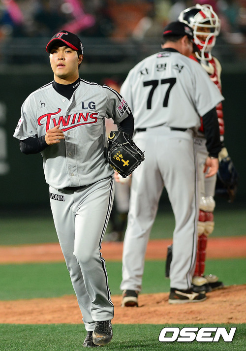 8일 오후 서울 목동구장에서 열린 '2012 팔도 프로야구' 넥센 히어로즈와 LG 트윈스의 경기 6회말 1사 주자 1,2루 넥센 이택근 타석에서 LG 선발 최성훈이 마운드를 내려가고 있다.